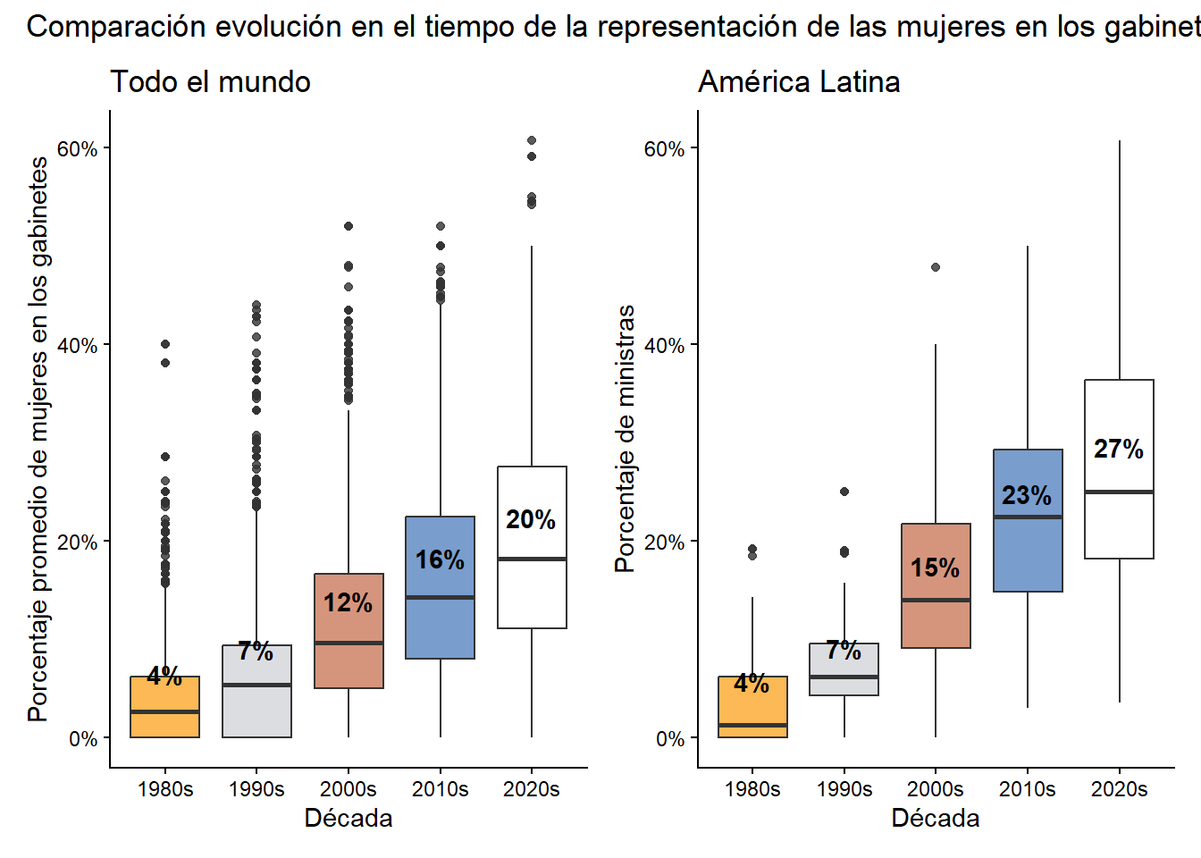 | Total ministras | Cargos totales | N (país-año) | Proporción global | Promedio país-año | Mediana país-año | IQR país-año |